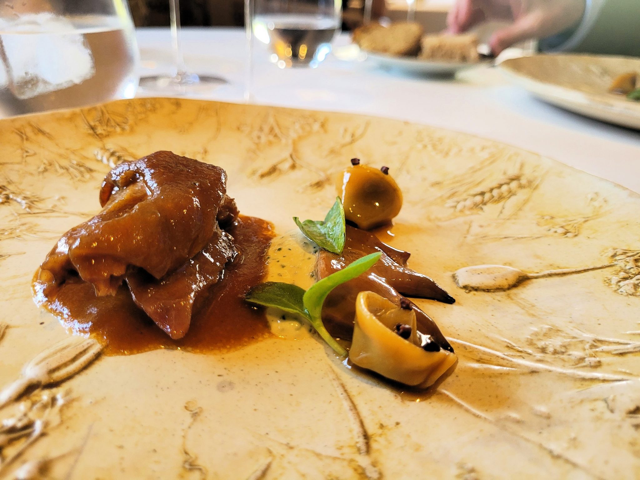 En esa misma línea de emoción a través de la tradición el pitu guisado con tortellini de sus interiores y escabeche de hierbas marinas. El pollo guisado como aprendió de su madre, pero los acompañamientos aumentan la extensión gustativa. La incorporación de la cresta cambia por momentos la textura, los tortellini aumentan la suculencia y esa mayonesa (hecha con grasa de pitu) de salicornia rejuvenece el conjunto, lo transforma, otorgándole frescura y diversidad. Bravo.