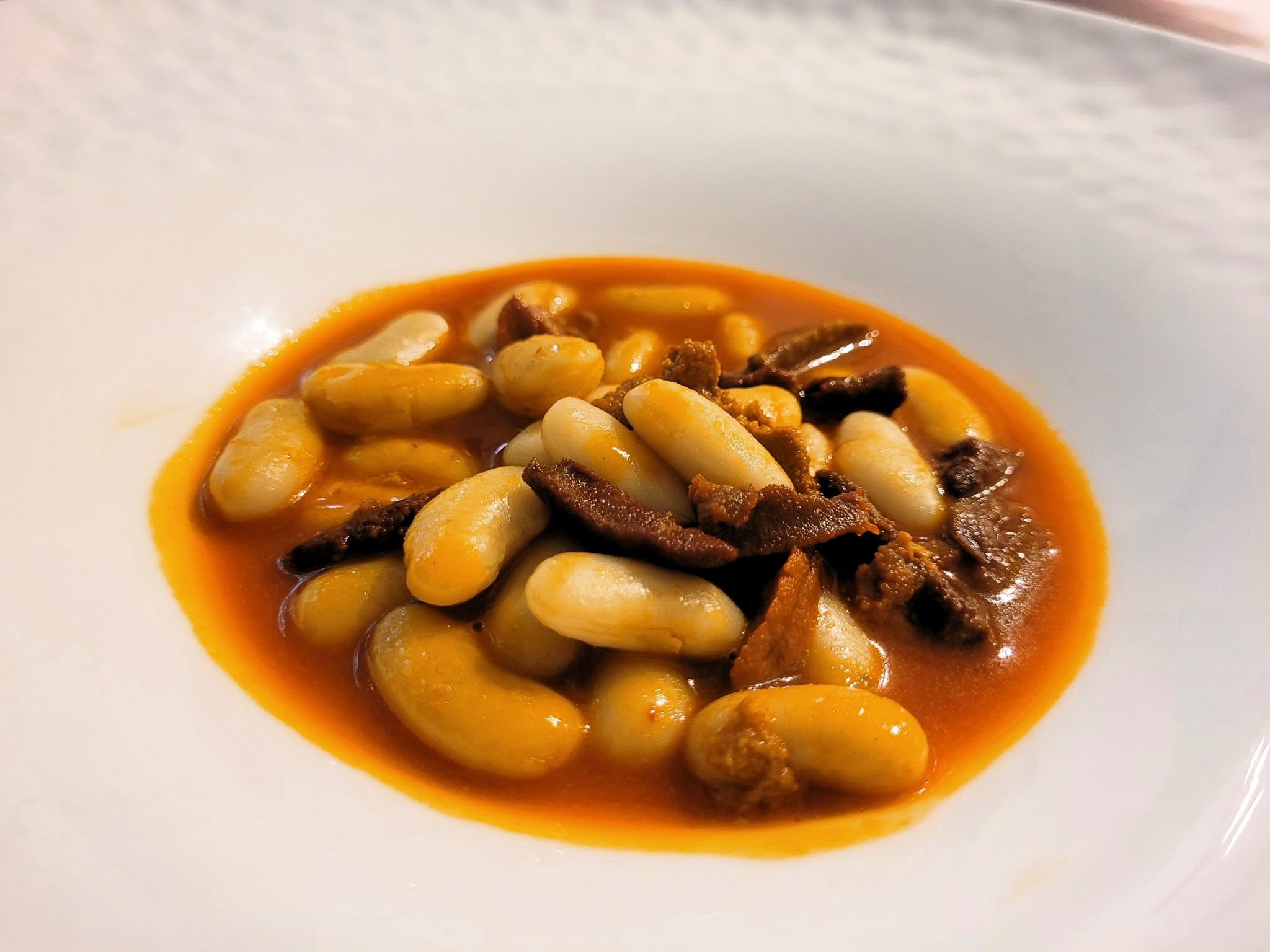 Otra de las novedades de Güeyu Mar, como han podido comprobar, es la incorporación de la cuchara. Sin duda un verdadero acierto para ampliar la amplitud de la carta y poder dividir una comanda en entrantes, cuchara y pescado a la brasa. También probamos las fabes con bogavante. En este caso, me parecieron soberbias. Una vez que la faba es buena y el guiso está bien trabado, lo importante es qué se le echa para dotarlas de ese sabor marino. Y en esa línea, bogavante en cantidades generosas con todos sus jugos. Sin duda, un nuevo indispensable de Güeyu Mar.