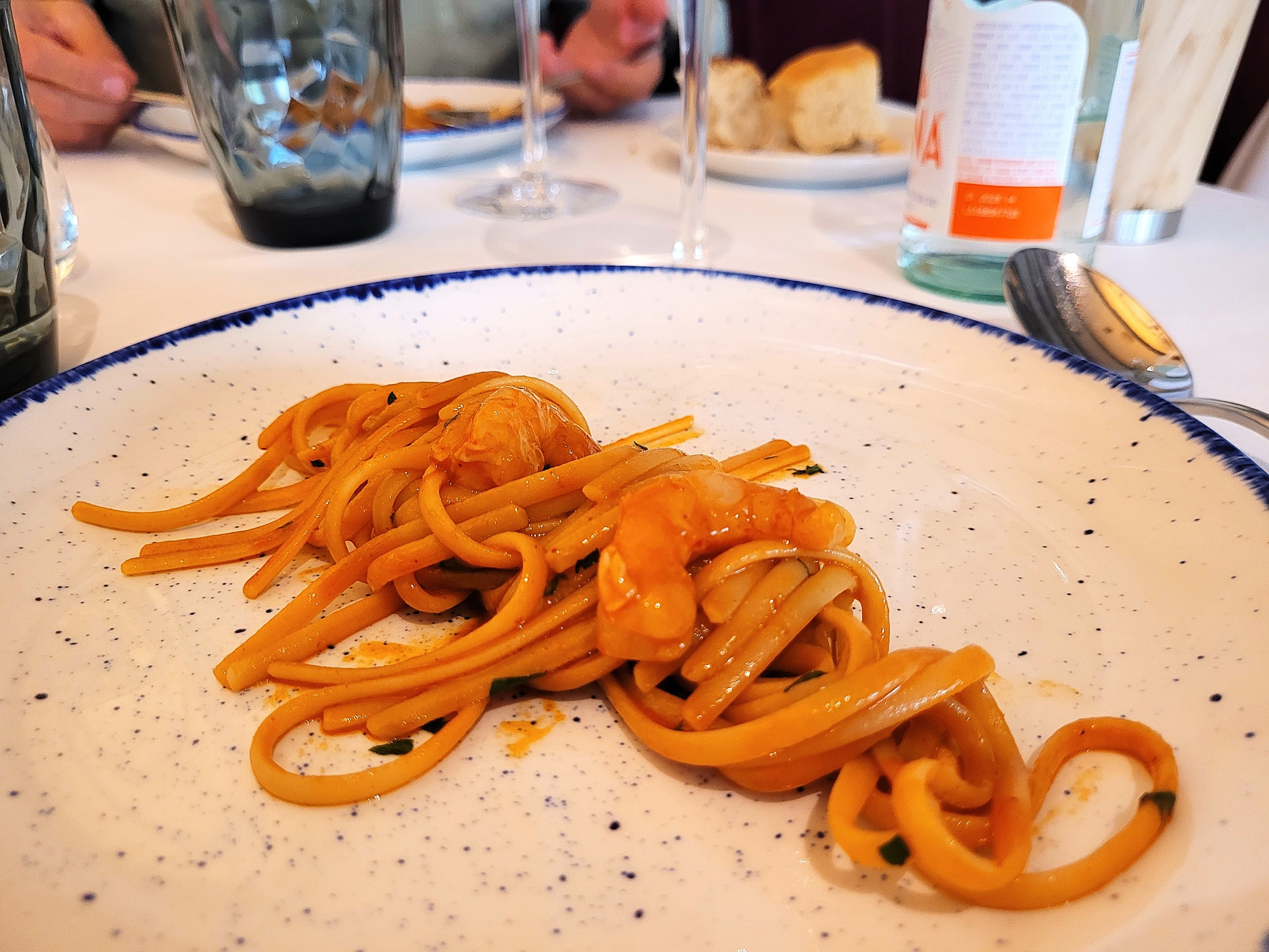 A continuación, el linguini en salsa de gamba roja en el que se respira cierta opulencia desde una perspectiva absoluta de franqueza y simplicidad. De esos platos de pasta que reconfortan por derecho y se deben probar. Sabor a mar, a los jugos de las cabezas de las reinas del mar.