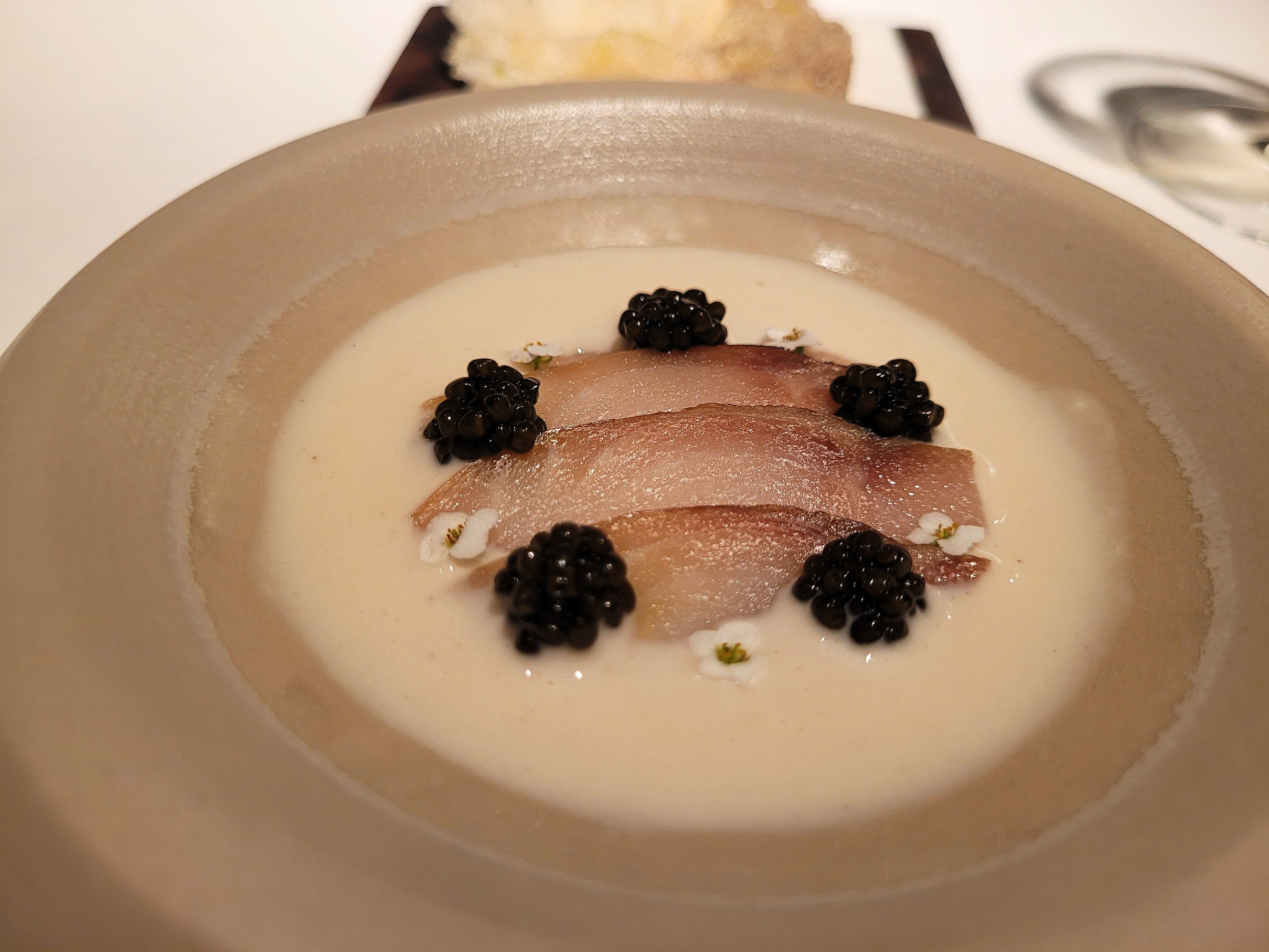 No podía faltar la croqueta de jamón, uno de los bocados emblemáticos de Javier Sanz y Juan Sahuqillo, que se acompaña con una lámina de coppa Joselito. Ésta se toma antes y por separado para fortalecer posteriormente el sabor a jamón. La croqueta realmente superlativa, por su delicadeza. Finísima cobertura, una pizca de panko para aportar crujiente y el interior de elevada cremosidad y sabor equilibrado entre el punto láctico de la leche fresca y la mantequilla y el umami que aporta el jamón.