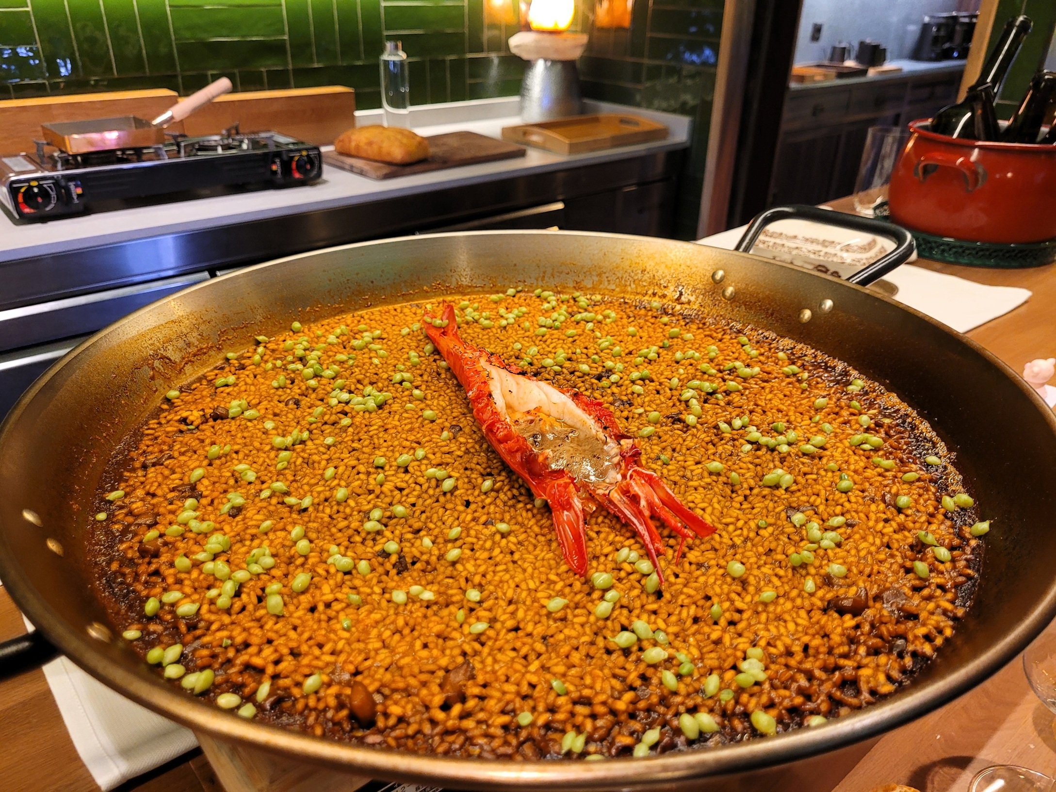 El primer arroz que genera cierto sobresalto es el arroz seco de carabinero y guisantes lágrima. El grano se encuentra totalmente suelto y aldente. Si se toma solo se percibe cómo éste ha absorbido el caldo del crustáceo. Si se hace junto con los guisantes, el gusto pega un giro radical y tiene brochazos yodados y herbáceos, convirtiéndose en algo único.