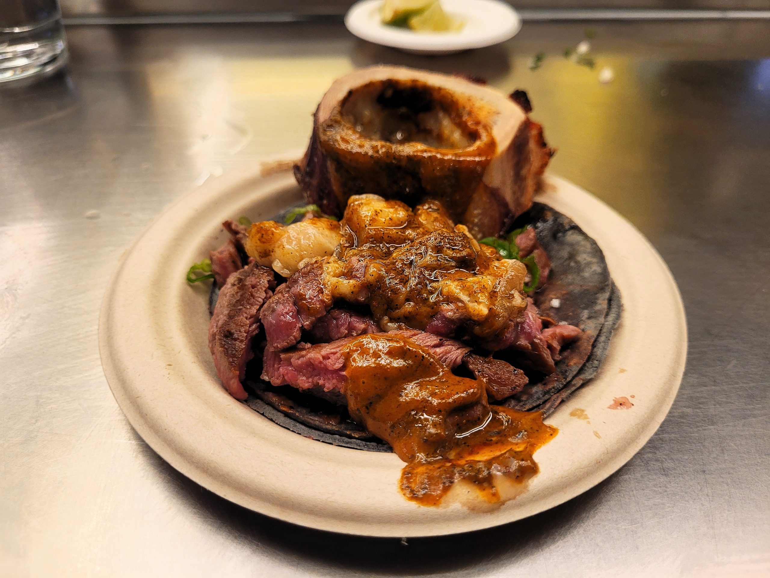 No podía faltar el taco más “instagrammeable”, el de tuétano con solomillo y salsa tatemada. Cabe destacar que en este caso hay salsas adaptadas a los ingredientes del taco. El punto ahumado de la salsa le va de maravilla a la carne y a la grasa. Doble tortilla para soportar la carga ya que se trata de un taco pringoso, suculento y muy disfrutable.